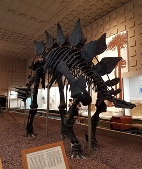 In the Jurassic gallery at the New Mexico Museum of Natural History, the Stegosaurus is a particularly attractive dinosaur mount. Mounted with the head up and tail off the ground, this pose makes the Stegosaurus look larger and certainly much longer. This specimen also has some very attractive plates, arranged in staggered rows from neck to tail. Sometimes the plates on Stegosaurus seem very sparse considering the size of the animal, this one does not.