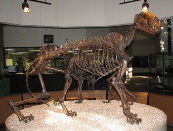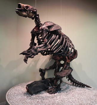 Based on their distribution throughout the world today and modern history, most Americans don’t realize perhaps that horses and camels both evolved in ancient North America and then spread elsewhere around the globe. In both cases they went extinct in North America but survived elsewhere, with horses only reintroduced in more modern times. The La Brea Tar Pits & Museum display a striking skeletal mount of an ancient North American camel called Camelops hesternus. The extinct “Western Horse” Equus occidentalis can also be found on display. Another large mammal that has been found in the tar pits is Paramylodon, better known as Harlan’s ground sloth. This very large sloth has been found throughout North America and the species survived for a very long time, almost 5 million years, before going extinct alongside many of the other large North American mammals at the end of the Pleistocene epoch.