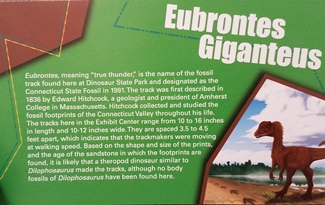 The majority of tracks in the Exhibit Center at Dinosaur State Park represent the ichnogenus Eubrontes, which was made by a relatively large bidpedal dinosaur. These tracks are very common throughout the valley, and in 1991 Eubrontes was designated the state fossil of Connecticut.