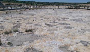 The dinosaur tracksite was discovered in the early 1980’s when a flood washed silt away from an earthen spillway above the 1950’s-constructed dam which created nearby Clayton Lake. As the earth was washed away, a layer of rock dated to about 100 million years old was revealed, and in the rock were hundreds of dinosaur footprints, including several pathways.