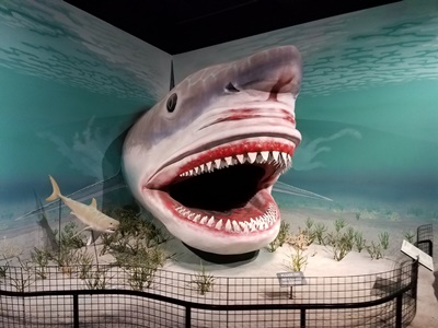 The next room was quite memorable. Prior to our most recent visit it had been a couple years before our last one. I asked my younger son what he remembered from the museum and he immediately said “the Megalodon.” Indeed, the Megalodon display is likely to stick, especially for young children. While not a fossil, the life-size replica of the head coming out of the wall is enough to scare a lot of people. In my three visits to this museum, I have seen numerous children (and a few adults) who really don’t feel comfortable getting very close to the mouth of this enormous creature. It’s a great display.