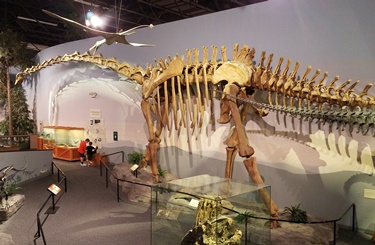 Around the first big bend of the dinosaur rooms are two of the largest dinosaurs ever discovered in North America. The longest here at over one hundred feet is the diplodocid Supersaurus. It is very impressive, positioned against the back wall. Nearby are a number of great Jurassic dinosaur fossils, including an Allosaurus, Ceratosaurus, and the stegosaur Hesperosaurus.