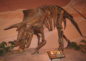 Toward the end of the large gallery are dinosaurs from the late Cretaceous period, including the iconic Triceratops. The stars of this portion of the museum, though, are the two Tyrannosaurus that are displayed fighting over the remains of a hadrosaur. Other dinosaurs featured here are Chasmosaurus, Thescelosaurus, and a pair of Edmontosaurus–one juvenile, one adult.