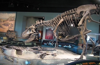 The recently renovated Natural History Museum of Los Angeles County has many fantastic dinosaur displays, including a very large Mamenchisaurus and one of the finest looking Triceratops anywhere. But the stars of the show in Los Angeles are undoubtedly the three Tyrannosaurus fossils that are displayed together, shown circling some remains of an unfortunate hadrosaur. The exhibit shows an adult, a juvenile, and a two-year-old T. rex which is perhaps the youngest Tyrannosaurus on display in the world. This “growth series” demonstrates how quickly Tyrannosaurus must have grown, and how large a young or juvenile Tyrannosaurus still had to go to reach full size. It’s one of the best dinosaur exhibits anywhere.