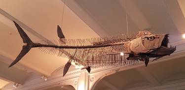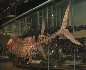 One of the more common displays in prehistoric exhibits is the Xiphactinus, the largest bony fish of the Late Cretaceous period. Among the reasons that it is a popular display in natural history museums: it is quite large (adults can reach 15-20 feet in length); it looks very ferocious and evidently had a large appetite; and most of all, because there have been quite a few well-preserved fossils unearthed of this magnificent ancient fish.