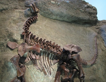 At the beginning of the dinosaur halls, the Triassic dinosaurs feature some of the earliest dinosaurs known. Herrerasaurus comes from South America and is a very early carnivorous, bi-pedal theropod. A Triassic fossil that is eye catching is the fantastic mount of the phytosaur Redondasaurus. The huge jaws are very impressive, and the mural behind presents a beautiful Triassic scene.