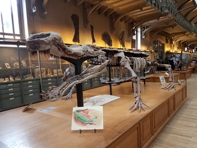 While Sarcosuchus wasn’t a dinosaur, there are quite a few dinosaurs on display in Paris. The cast of Andrew Carnegie’s famous Diplodocus still stands in the main gallery, surrounded by several carnivores, including the North American Allosaurus and the South American Carnotaurus.