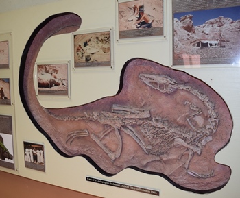 The mural behind the Smilosuchus mount shows many of the animals and plants that are found at Ghost Ranch. One such animal is the colorfully named archosaur Effigia okeeffeae, which means “O’Keefe’s ghost.” Effigia was discovered in 2006 in one of the 1947 quarry blocks by paleontologist Sterling Nesbitt while a graduate student at AMNH in New York. Nesbitt was later the lead author in the formal description of the Ghost Ranch dinosaur Tawa, a smaller but similar dinosaur to Coelophysis which lived several million years earlier and was fairly close to the base of the dinosaur tree. In the museum there is a small display with fossils and pictures of Tawa.