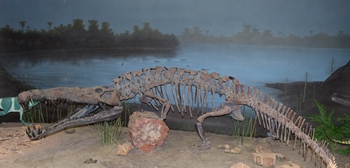 The largest fossil mount in the museum is that of a Smilosuchus, a large phytosaur that was one of the apex predators of the late Triassic. The skeleton is actually a composite, with a skull of Smilosuchus, while the body of the skeleton comes from a closely related and contemporary phytosaur called Pseudopalatus. The very large skull was found on Ghost Ranch near the log cabin at the entrance to the property from the highway. In the display, the Smilosuchus patrols the shoreline near a misty lake looking for its next meal. My son was very impressed by this mount, and we spent quite a bit of time admiring the huge skull.