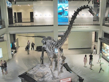 Before the opening of the Morian Hall of Paleontology in 2012, visitors could see a wonderful dinosaur mount before entering the paleontology exhibits. The gigantic and beautiful Diplodocus was mounted in the grand hall, standing stately and beckoning visitors to enter the paleontology area. In the somewhat enclosed space of the lobby, the size of the creature was almost overwhelming. Today, this fossil has been cleaned and restored, and moved into the Morian Hall with the other dinosaurs, and its pose is slightly different as well, now assuming more of a tripod position with its tail so that it could rear up to eat higher leaves. I loved the old display, but I have to admit the new one is even more dramatic.