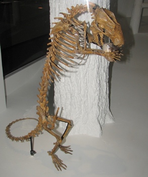 There are many more great dinosaurs at HMNS, one of my favorite displays shows a small feathered theropod dinosaur called “Julieraptor,” not yet formally named. In the scene, this small raptor is perched on a limb while the Cretaceous mammal Didelphodon harasses it from below. The HMNS fossil of Didelphodon is the most complete such skeleton in the world and indicates this mammal was more like a tasmanian devil than an opossum, as previously thought. With powerful jaws and a lithe, active body that resembled an otter, Didelphodon can now be viewed as much more of a combatant rather than a creature that simply hid during the time when mammals were small and dinosaurs ruled the earth.