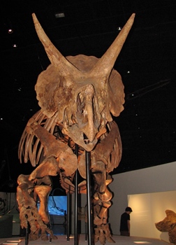 Certainly one of the highlights at HMNS is “Lane” the Triceratops, one of the most important of his type yet discovered. “Lane” has the most complete foot bones ever found on a Triceratops, and those help scientists make accurate assessments of how the huge herbivore’s body was configured, how it stood, and how it moved. Perhaps more importantly, “Lane” also was found with preserved patches of skin, which is exceedingly rare among dinosaurs. Visitors can see the preserved fossilized skin patches right near the “Lane” display. Unfortunately the color of the skin doesn’t fossilize, as fossils take the color of the surrounding minerals in the rock. But the skin patches do give us a much better understanding of what Triceratops looked like when it lived.
