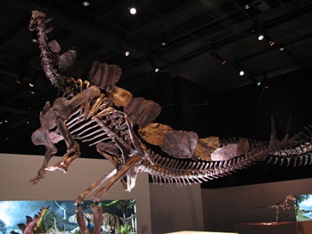 As you wind your way through the exhibit halls, you eventually end up in a large open hall that contains some of the most interesting dinosaur displays in the world. A large, beautiful Allosaurus greets visitors, and just beyond is an incredible dinosaur mount of a Stegosaurus rearing on its hind legs. The idea is controversial, but Dr. Bakker maintains that this pose was possible for Stegosaurus. It’s a great display, certainly not what most people are expecting to see. One thing that is really noticeable in the display is how long a Stegosaurus was. At HMNS the skeleton is really stretching and looks very long compared to the usual static display where the creature is generally hunkered down and doesn’t seem nearly as large.