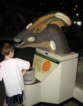 A wonderful display demonstrating the sound-making capabilities of the Parasaurolophus can be found in the “Evolving Planet” exhibit at The Field Museum in Chicago. Right next to the skeletal mount of the dinosaur is a display which allows visitors to push an accordian-like device to create a sound that mimics what a Parasaurolophus might have sounded like. This is a very popular exhibit with children and adults alike and helps make this dinosaur a favorite for many.