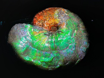 There are other fossils (and casts) worth seeing outside the exhibit. The Hall of Birds is directly above the Life Then and Now gallery, and contains skeletal mounts of several animals located on the evolutionary path between dinosaurs and birds, including Deinonychus, Archaeopteryx, and Hesperornis. One of the most beautiful fossils in the museum can be found in the Gems & Minerals Hall: a fantastic iridescent ammonite. The display is very well lit and the fossil really stands out against the black background.