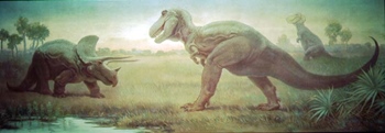 Among the great highlights at The Field Museum is the series of 28 murals by Charles R. Knight that hang throughout the Evolving Planet exhibit. Commissioned by the Field Museum in 1926 and completed in 1930, the murals represent the various stages of life on earth from before the earliest fish and plants all the way to the most recent megafauna of the last Ice Age around 10,000 years ago. Among them are some of the world’s most famous paintings of prehistoric life, including arguably the most well-known of all dinosaur art, the Tyrannosaurus vs. Triceratops mural. It may not be the Mona Lisa of dinosaur paintings, but it might well be The Last Supper, at least for the hungry Tyrannosaurus!