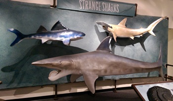 As far as the dinosaur era goes, one of my favorite rooms in the museum is the Mesozoic gallery, which houses a bunch of nice fossils from the Western Interior Seaway. Among them include the pterosaur Nyctosaurus, the large fish Xiphactinus, vertebrae and teeth from the Cretaceous shark Cretoxyrhina, a very impressive sea reptile Mosasaurus, and one of the favorite fossils for both my sons–a long display of a plesiosaur neck and skull that is embedded in the floor of the room! Every time we go my sons insist on doing the “plesiosaur walk” as we call it…in other words marching up and down the impressive length of this ancient sea reptile.