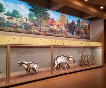 Besides the great collection of fossils, the Hall of Mammalian Evolution also boasts a second beautiful mural by Rudolph Zallinger, called The Age of Mammals. While much smaller than the Age of Reptiles mural in the Great Hall, the second mural is equally packed with prehistoric life and is very colorful and vibrant. It’s a wonderful piece of art, and without doubt a highlight of the YPM. Both of the murals at YPM were featured in a multi-issue series of Life Magazine in 1953, and his work has greatly influenced paleoart.